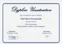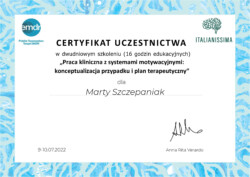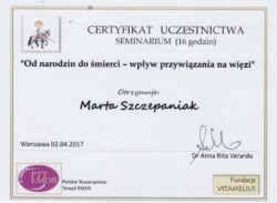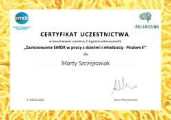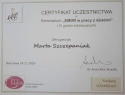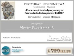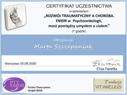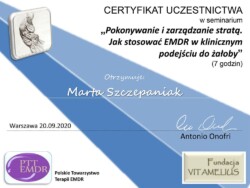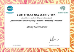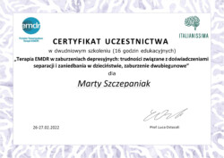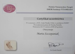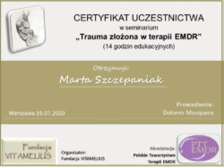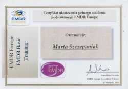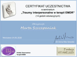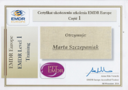 Jestem również certyfikowanym terapeutą EMDR (Eye Movement Desensitization and Reprocessing), członkiem Polskiego Towarzystwa Terapii EMDR.