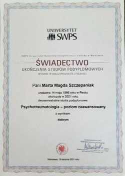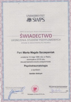 Ukończyłam psychologię na Uniwersytecie Łódzkim (specjalność: psychologia rodziny). Jestem absolwentką psychoonkologii oraz psychotraumatologii na Uniwersytecie Humanistycznospołecznym SWPS w Warszawie a także psychotraumatologii oraz psychotraumatologii zaawansowanej na Uniwersytecie Humanistycznospołecznym SWPS w Warszawie.