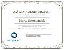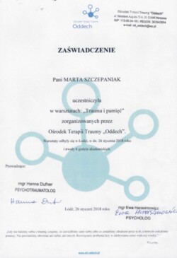 Biorę systematyczny udział w szkoleniach podnoszących kwalifikacje w obszarze pracy z traumą.